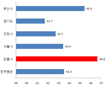강릉시 2021년 1인 가구수는 43,522세대,42.52%