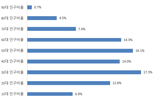 30~39세 인구가 전체의 약 17.25%로 가장 큰 비중을 차지합니다.