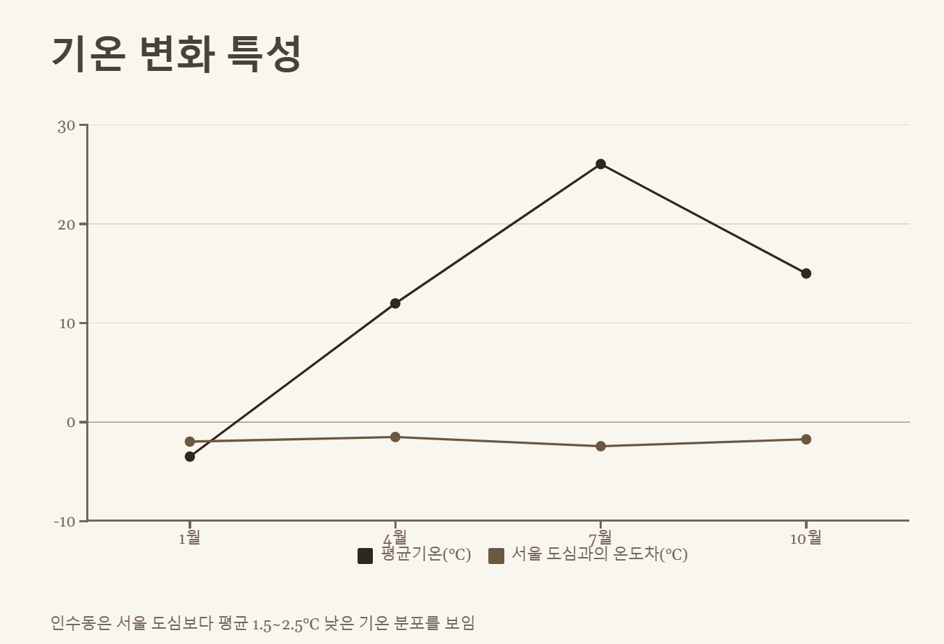 이러한 지리적 특성으로 인해 인수동은 서울 도심보다 평균 기온이