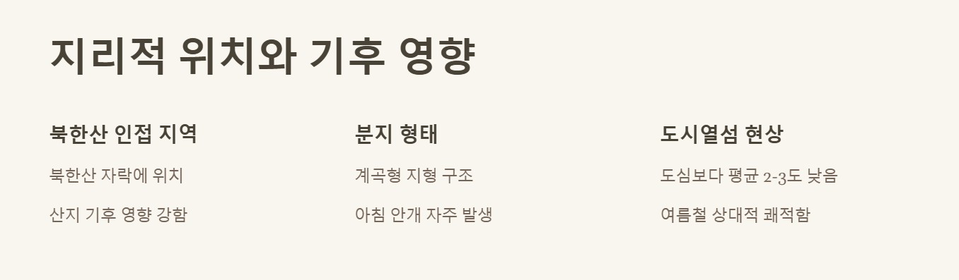 도심보다 열섬 현상이 약해 야간 기온이 1~2℃ 낮으나, 습도는 북한산의 영향으로 더 높을 수 있습니다.