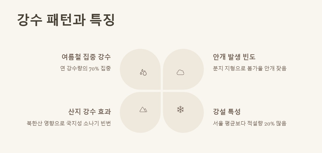 도심보다 열섬 현상이 약해 야간 기온이 1~2℃ 낮으나, 습도는 북한산의 영향으로 더 높을 수 있습니다.