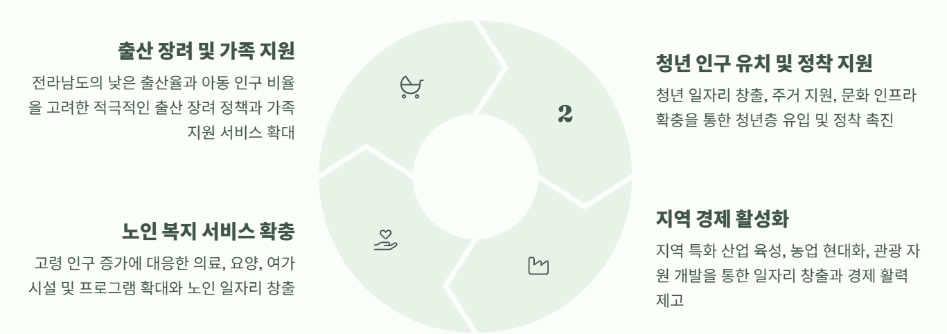 전라남도는 심각한 고령화와 생산가능인구 감소라는 인구 구조적 도전에 직면해 있습니다. 이러한 문제에 효과적으로 대응하기 위해서는 출산율 제고와 청년 인구 유치를 위한 종합적인 정책이 필요합니다.