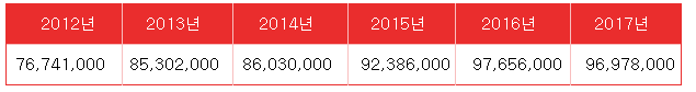 구분 | 2012년 | 2013년 | 2014년 | 2015년 | 2016년 | 2017년 |