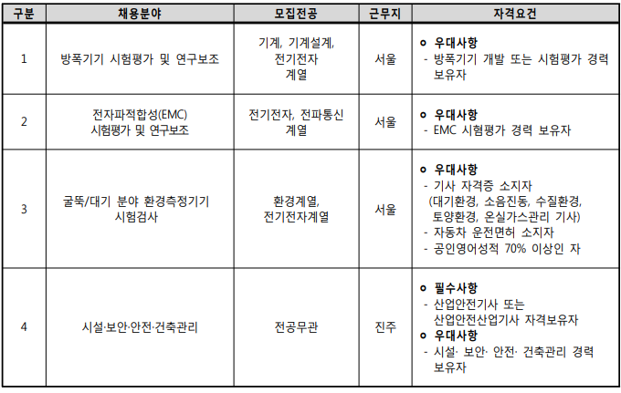 한국산업기술시험원 정규직 채용분야 지원자격
